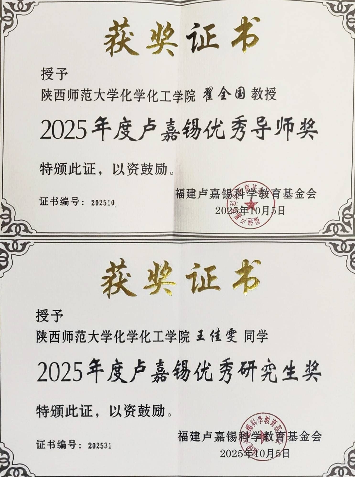 近日,经福建卢嘉锡科学教育基金会评审,我院翟全国教授获得2025年度卢嘉锡优秀导师奖、2023级博士研究生王佳雯获得2025年度卢嘉锡优秀研究生奖。