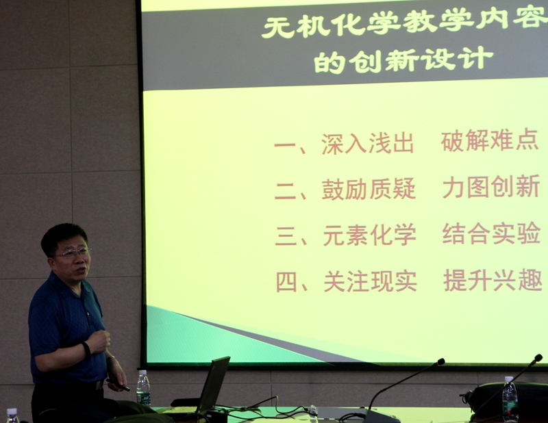 徐家宁教授以“无机化学教学内容的创新设计”为题做了报告,徐家宁教授重点介绍了如何做好无机化学教学方面的工作,以具体实例和我院老师分享了自己多年的从教经验。宋天佑教授以“做好教学工作的实践与思考”为题做了报告,他重点总结了吉林大学无机化学教学几十年以来的教学成果,分析了各时代教学方式与观念的变化,对当代新型教学形式--网络公开课及慕课进行了展望。