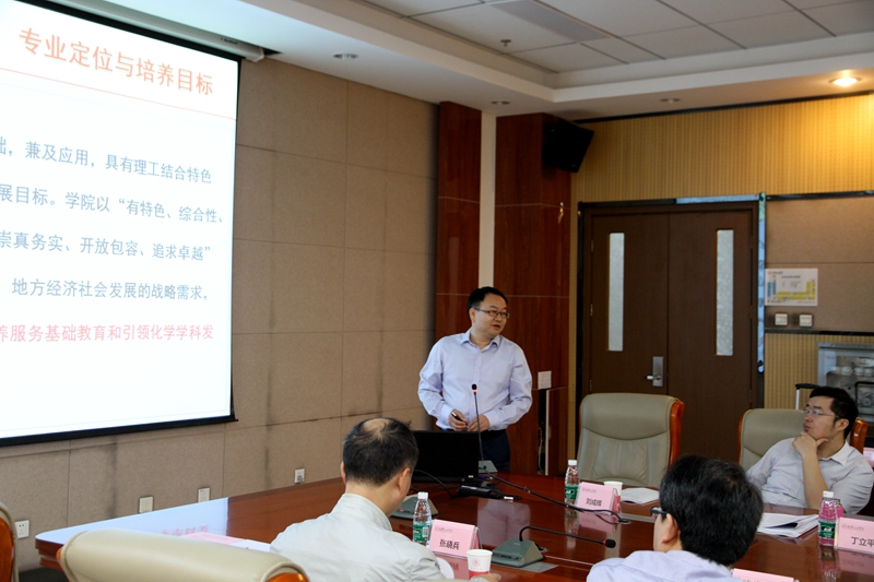 之后,薛东从学院历史、学位点现状、学生培养质量等方面向专家汇报了我院化学一级博士学位授权点情况。他指出,虽然化学学科近年来发展喜人,但是依然存在着师资体量较小、高层次人才队伍不足、科研方向不集中的问题。希望能在今后的建设中继续加大人才引进力度,进一步扩充专职科研人员队伍,打造具有特色的研究团队。