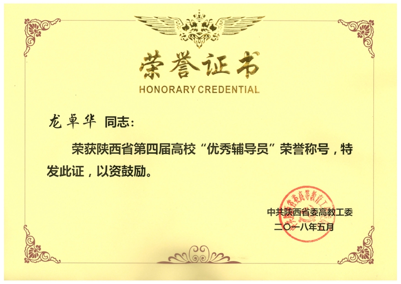 近日,由中共陕西省委高教工委主办的陕西省第四届高校十佳辅导员和优秀辅导员评选表彰活动结果揭晓,我院本科生辅导员龙卓华荣获“陕西高校优秀辅导员”荣誉称号。