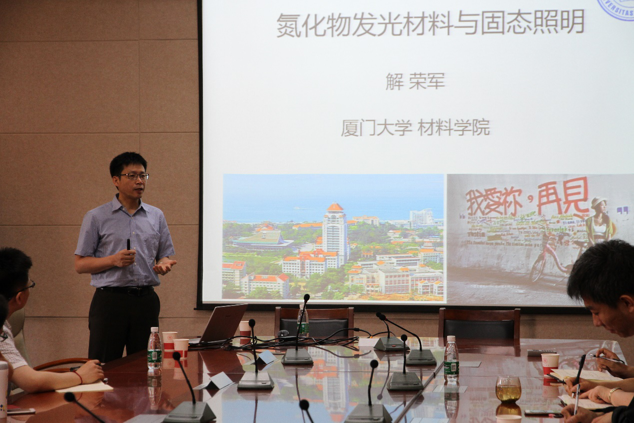 5月18日,厦门大学解荣军教授受邀来我院学术交流,在致知楼1568会议室为我院师生带来了题为“氮化物发光材料与固态照明”的学术报告。物理学院郑海荣教授、材料学院苟婧副教授、高级实验师晁小练,我院副院长焦桓教授、刘志宏教授等教师及相关专业研究生、本科生参加报告会。报告会由焦桓主持。