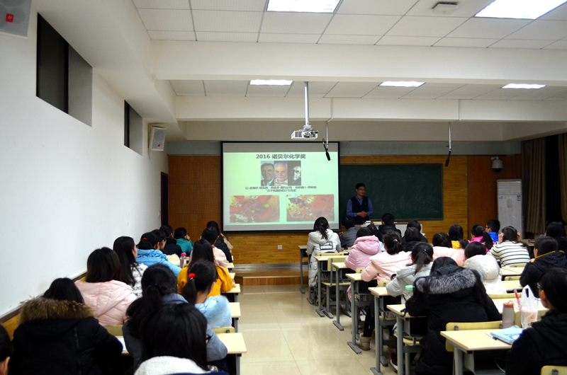 报告开始后,翟全国教授首先介绍我院无机化学教学组的学术团队和代表成果,接着从专业角度为同学们解读了配合物在无机化学领域的重要作用,重点分析了x单晶衍射技术对配合物结构及性质检测的作用。他还结合科技前沿信息,从2016年的诺贝尔化学奖带领同学们了解了“分子机器的设计与合成”。