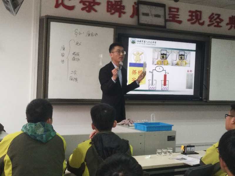 接下来,同学们观摩了公开课《原电池的化学反应原理》。白永龙老师授课语言风趣幽默,学生们对实验参与度高,充分体现了高效课堂的理念。课后讨论中,同学们向白老师请教了关于大学学习和年轻教师在岗位上遇到的问题,白老师分享了他的教学经历,并为同学们在备课和班主任工作等方面进行了指导。