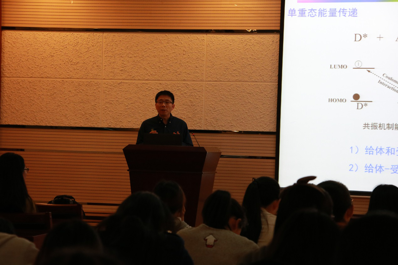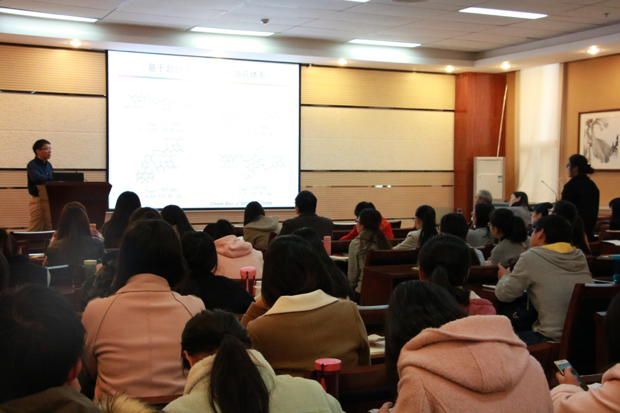 报告中,杨清正教授介绍了目前光捕获体系的研究进展和应用,并就其课题组关于超分子构筑的胶束和纳米晶的研究工作进行了详细解读。他讲到,其课题组利用超分子组装,构筑了几个具有高效光捕获性能的新型光捕获体系,并且制备方法简单,给体受体比例易于调控,避免了繁琐的合成和分离过程,为研究光捕获机制及在多个领域的潜在应用提供了基础。他在总结中指出,基于有机纳米晶的光捕获体系,纳米晶整齐有序的排列大大的提高了捕获效率。此外,能量给体与受体的种类可以方便的进行改变,并且二者之间的比例容易调节,为深入研究光捕获体系中的能量传递过程提供了新思路。报告结束后,杨清正教授与房喻老师展开了精彩的讨论并耐心解答了师生们的提问,赢得一片掌声。