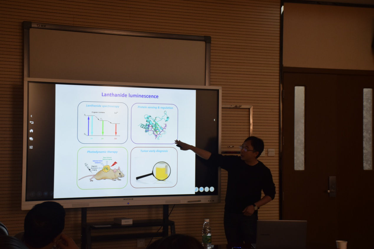 Ka-Leung Wong教授以镧系金属的天线效应为切入点,为大家介绍了时间分辨成像、Epstein-Barr病毒及Epstein-Barr核抗原等生物化学方面的知识,分享了室温下溶液中的分子上转换,利用Eu发射在体外直接进行纤毛成像以及通过Eu发射实时监测抗肿瘤药物的等工作。整场报告气氛活跃。会后,Ka-LeungWong教授还与在座师生就学术及留学问题进行了热烈讨论,我院师生受益匪浅。