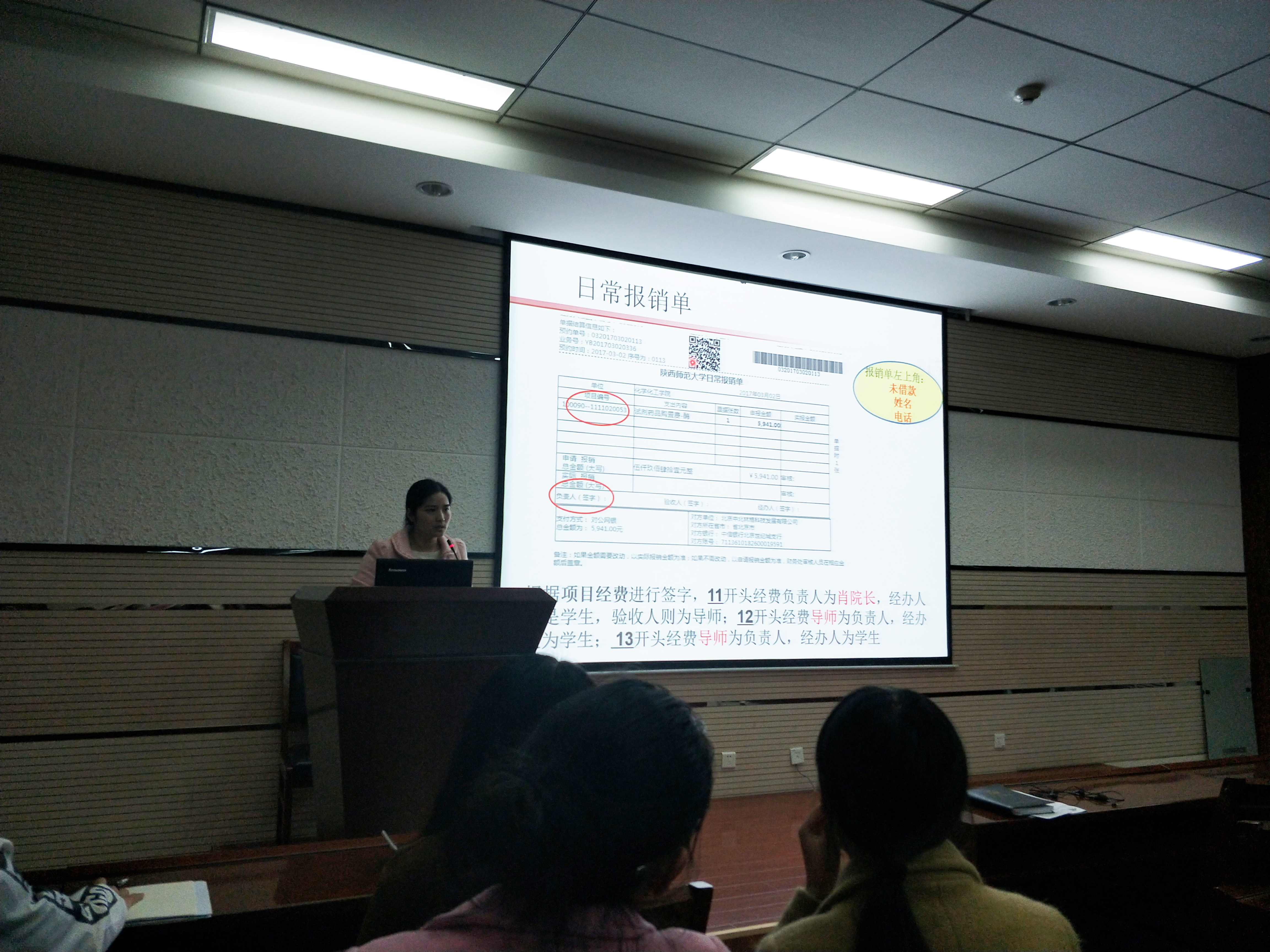 正值年末学校财务报销高峰时期,秉承服务广大师生,提高财务报销效率,降低退单率的原则,在学院肖新军副院长的提议下,经学院财务助理张伟和赵慧茹的精心组织,学院于2017年11月1号晚上7点在致知楼1668会议室,为我院师生进行了一场题为“网上财务报销基本知识及常见问题”的讲座,学院近150多位师生参加。讲座由我院具有5年丰富报账经验的分析化学专业博士生孙圆圆同学主持并讲解。