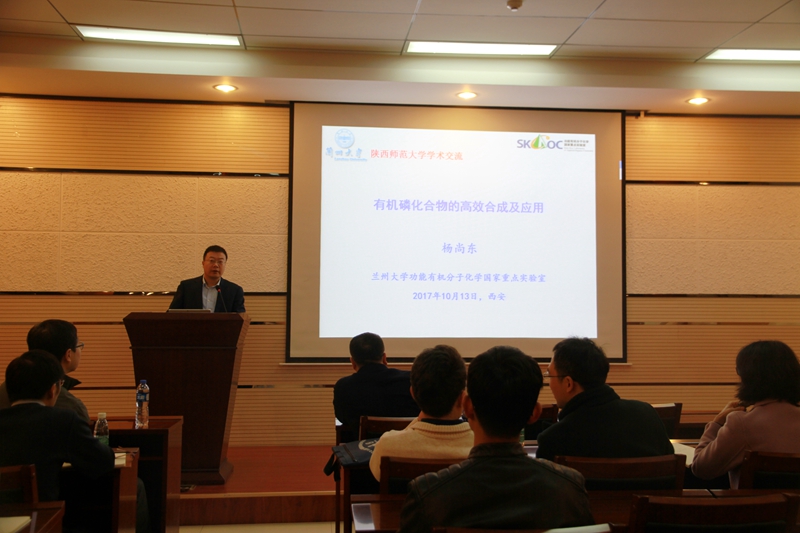 2017年10月13日上午,兰州大学杨尚东教授应我院院长薛东教授邀请访问我院,在致知楼1668报告厅为我院师生作了题为“有机磷化合物的高效合成及应用”的精彩报告。薛东教授、石先莹教授、王超教授、李超群教授、黄治炎副教授、李高强副教授、杨明瑜副教授、赵玉明副教授、王涛博士、雷海涛博士、李刚博士等教师及相关专业研究生、本科生聆听报告。报告会由薛东教授主持。