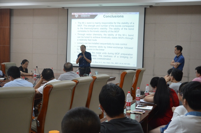 2017年7月26日上午,美国德克萨斯A&M大学周宏才教授受邀前来我院,在致知楼1568报告厅为我院师生作了题为“Assemble a Toolkit for Pore-Space Engineering in MOFs”的精彩报告。报告会由白俊峰教授主持,我院焦桓教授、翟全国教授、薛东旭副教授、简亚军副教授、顾泉副教授、王长号副教授、王艳艳博士等教师及相关专业研究生、本科生聆听了报告。