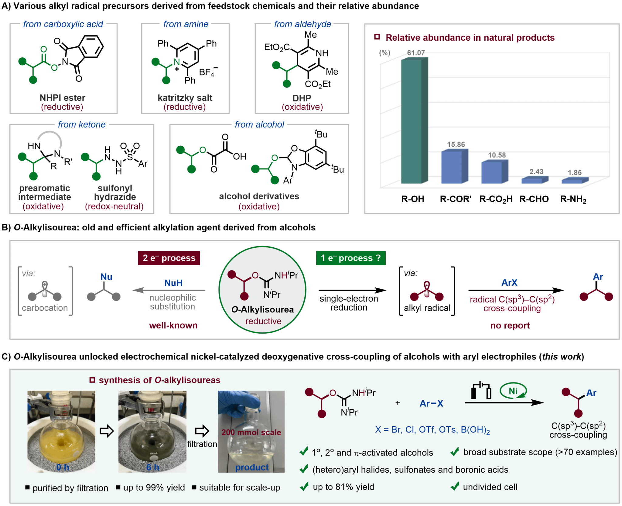 在过去近二十年里,基于镍-光氧化还原催化或电催化的交叉偶联反应在构建C(sp3)–C(sp2)键方面已经取得了重大进展。有别于传统C(sp3)–C(sp2)交叉偶联中有机硼、有机锌或格氏试剂的双电子转金属化途径,在上述体系中不同烷基自由基作为C(sp3)的核心组成部分,通过单电子转金属化与金属中心结合,使得反应条件更加温和、底物兼容性更强,在复杂分子合成中得到了应用广泛。因此,各种来源于羧酸、酮、醛、胺和醇的C(sp3)自由基前体被大量开发,并成功应用于各类自由基偶联反应(图1a)。其中,醇类化合物因其天然丰度高而成为特别有吸引力的基础原料。尽管Macmillan课题组发展的苯并噁唑鎓盐(NHC)介导的脱氧自由基型C(sp3)–C(sp2)交叉偶联已经为醇的转化提供了一种高效的方法,但目前该策略主要局限于活化中间体需原位制备、需要借助光敏剂氧化活化。因此,开发由醇衍生且能够稳定分离烷基化试剂,经还原活化产生C(sp3)自由基的方法具有非常重要的研究价值和应用前景。