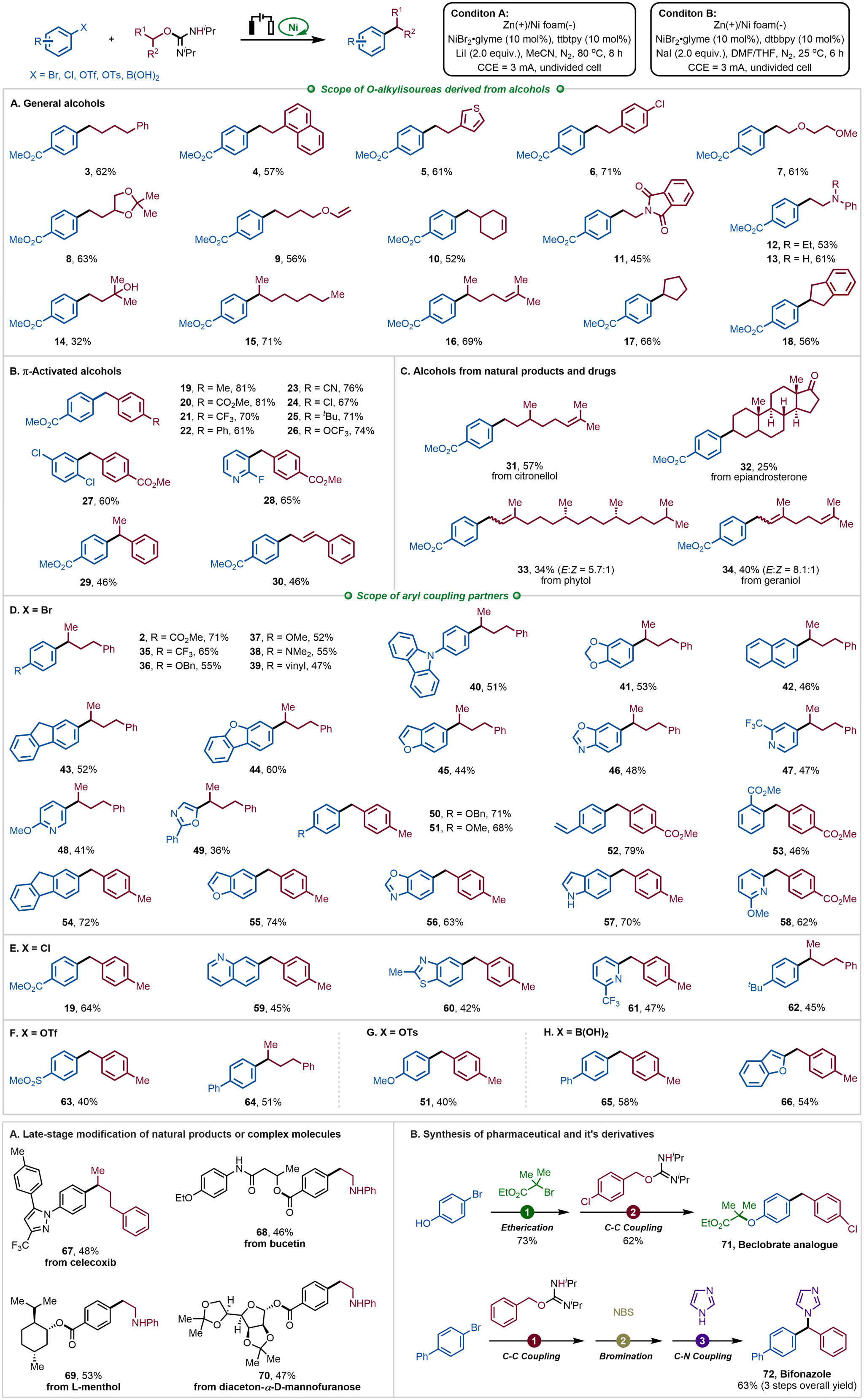 该工作首次实现了氧-烷基异脲的电化学还原活化,将醇衍生物转化为稳定且可调控的C(sp³)自由基前体;通过镍催化与电化学的协同,构建了兼具绿色性、普适性及实用性的C(sp³)-C(sp²)交叉偶联体系。该方案不仅拓展了醇衍生物的转化路径,也为自由基参与的过渡金属催化反应提供了新的设计思路。