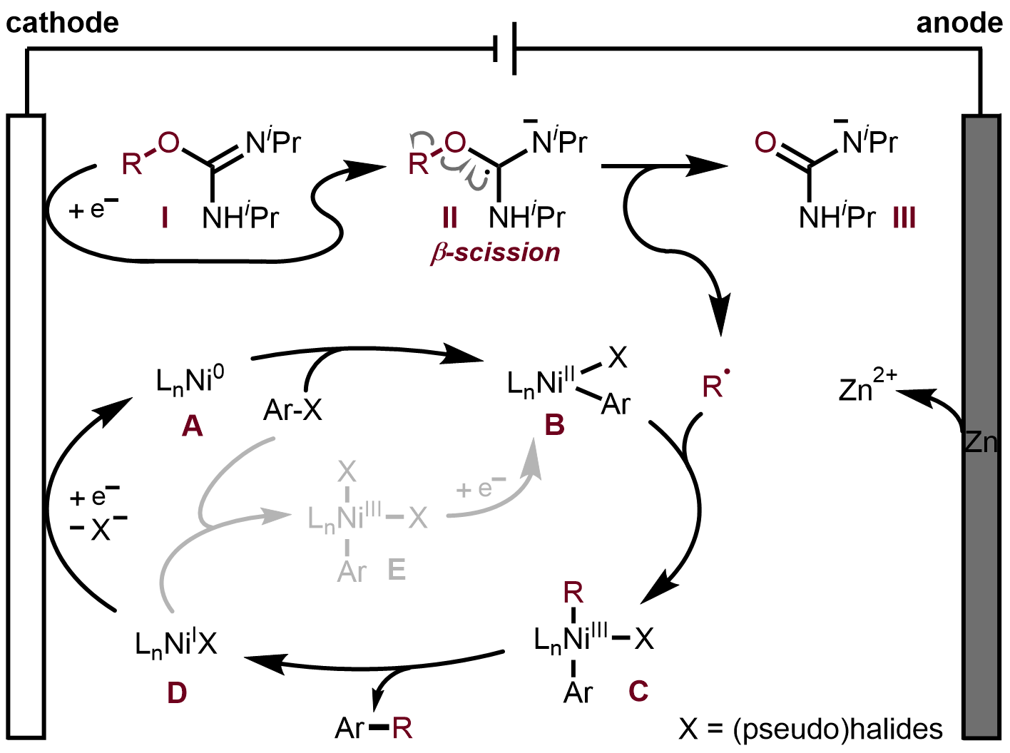 控制实验和初步的机理研究表明,阴极还原氧烷基异脲生成自由基阴离子,经β-裂解生成烷基自由基是该反应的关键步骤;电还原产生的Ni(0)与芳基亲电试剂氧化加成生成Ni(II)中间体,随后与烷基自由基发生单电子转金属生成Ni(III)物种,最终还原消除得到C(sp³)-C(sp²)偶联产物,同时再生Ni(I),经阴极还原回到Ni(0)完成循环。