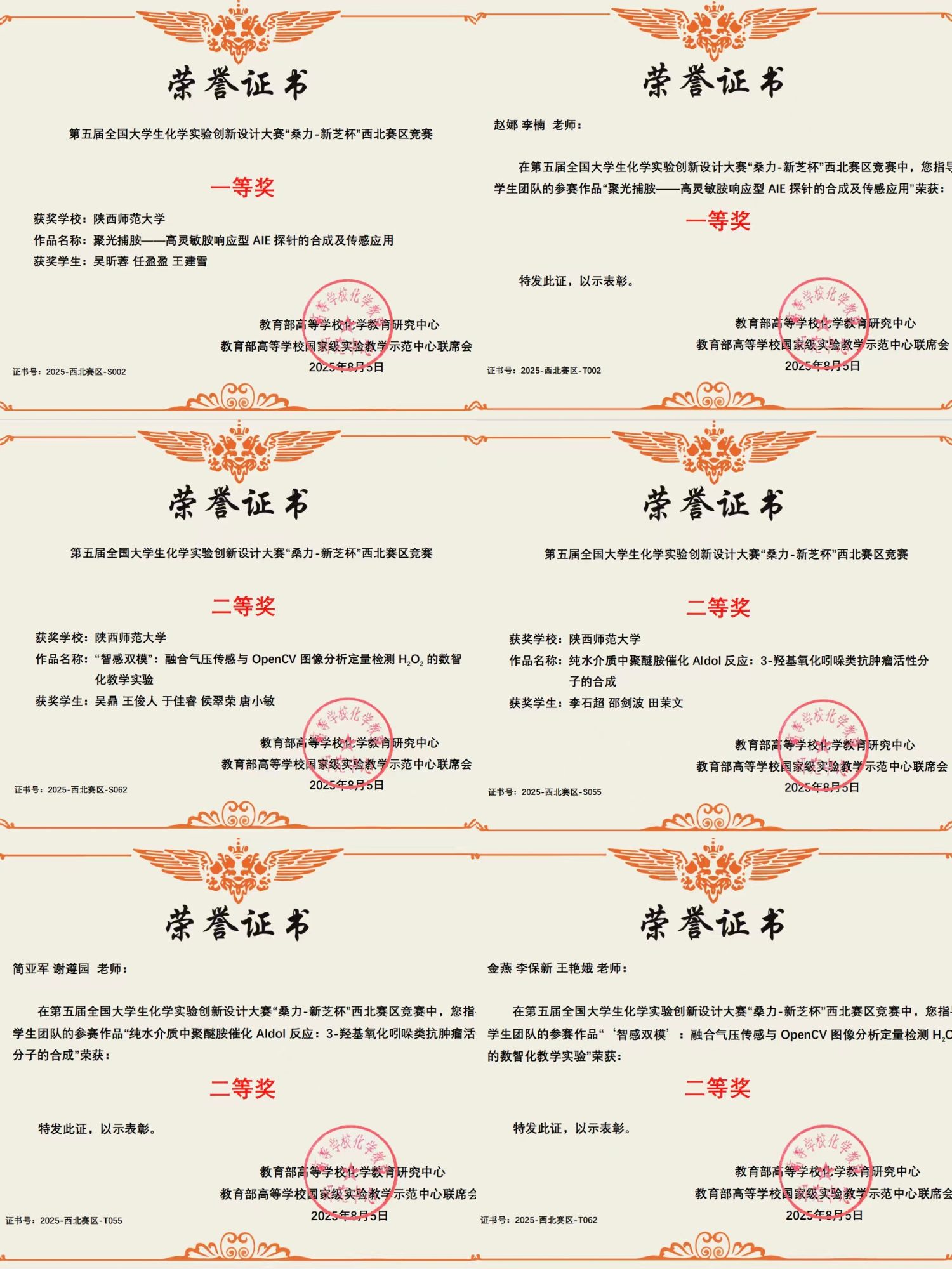 7月29日至31日,第五届全国大学生化学实验创新设计大赛西北赛区竞赛在太原理工大学开赛。我院组建了4支队伍,分别参与新创实验、科普实验、改进实验和数智化实验四个赛道的比拼。经过激烈角逐,由吴昕蓉、任盈盈、王建雪组成的新创实验队(指导教师:赵娜、李楠)和张雄飞、张钰涵、隆忠财组成的科普实验队(指导教师:高玲香、王艳艳)均获一等奖,李石超、邵剑波、田茉文组成的改进实验队(指导教师:简亚军、谢遵园)和吴鼎、王俊人、于佳睿、侯翠荣、唐小敏组成的数智化实验队(指导教师:金燕、李保新、王艳娥)获得二等奖。按照赛事规则,获得一等奖的科普实验队直接获得全国总决赛二等奖,新创实验队代表学校晋级参加全国总决赛。